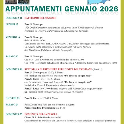 Domani domenica 25 gennaio, domenica della Parola, nel Santuario di Nostra Signora delle Grazie in Genova, alle ore 16.00 Roberto Aicardi, che presta servizio nella nostra fraternità di parrocchie, in cammino verso il Diaconato permanente, riceverà dalle mani del Vescovo il ministero del Lettorato, a servizio della Parola di Dio e della comunità. Sperando di …